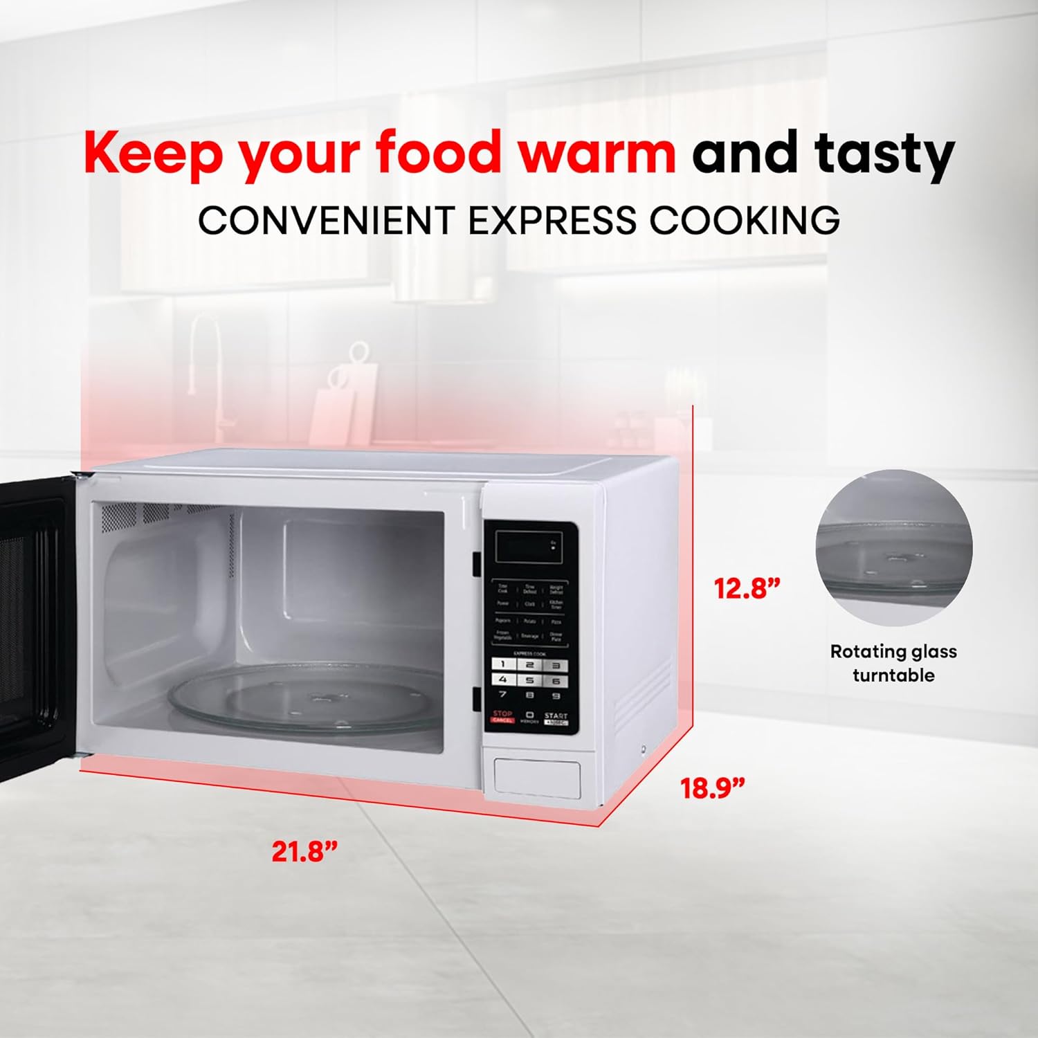 Slika 1: Mikrovalna pećnica s dimenzijama i sklopom okretnog tanjira. Uređaj mjeri približno 21.8 cm širine, 12.8 cm visine i 18.9 cm dubine. Rotirajući stakleni okretni tanjir vidljiv je unutar unutrašnjosti pećnice.