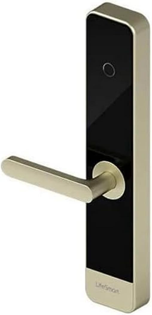 This image displays the LifeSmart LS101GS Smart Door Lock. It features a sleek, modern design with a gold-colored handle extending horizontally from a vertical black panel. The panel has a circular fingerprint sensor near the top and the 'LifeSmart' logo at the bottom. The overall structure is rectangular with rounded edges, indicating a contemporary aesthetic suitable for various door types.