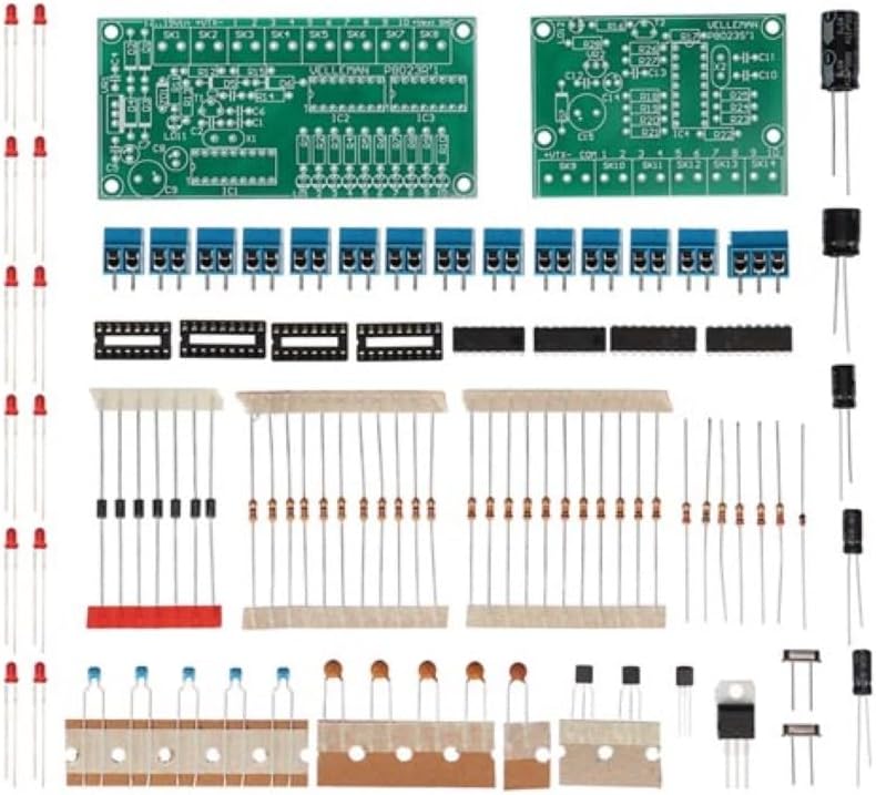 Slika 3.1: Sve komponente uključene u Whadda WSRC8023 DIY komplet za lemljenje, prikazujući dvije zelene PCB ploče, razne otpornike, kondenzatore, LED diode, integrirana kola, terminalne blokove i antensku žicu.