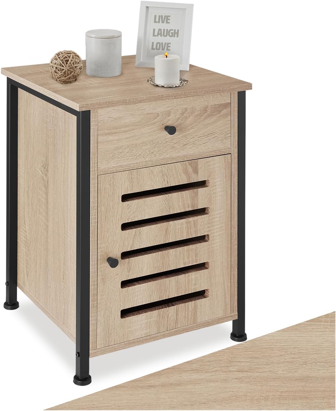 Thank you for choosing the tectake Waterford Side Table / Nightstand. This versatile piece of furniture combines warm wood aesthetics with cool steel elements, offering both functionality and a stylish industrial design. It features an adjustable shelf, a convenient drawer, and a door compartment, providing ample storage solutions for various items.