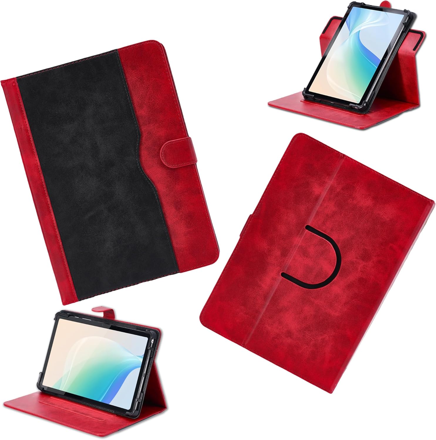 The bojioderf tablet case in red and black, showcasing its design and how a tablet fits within it, including its ability to stand upright.