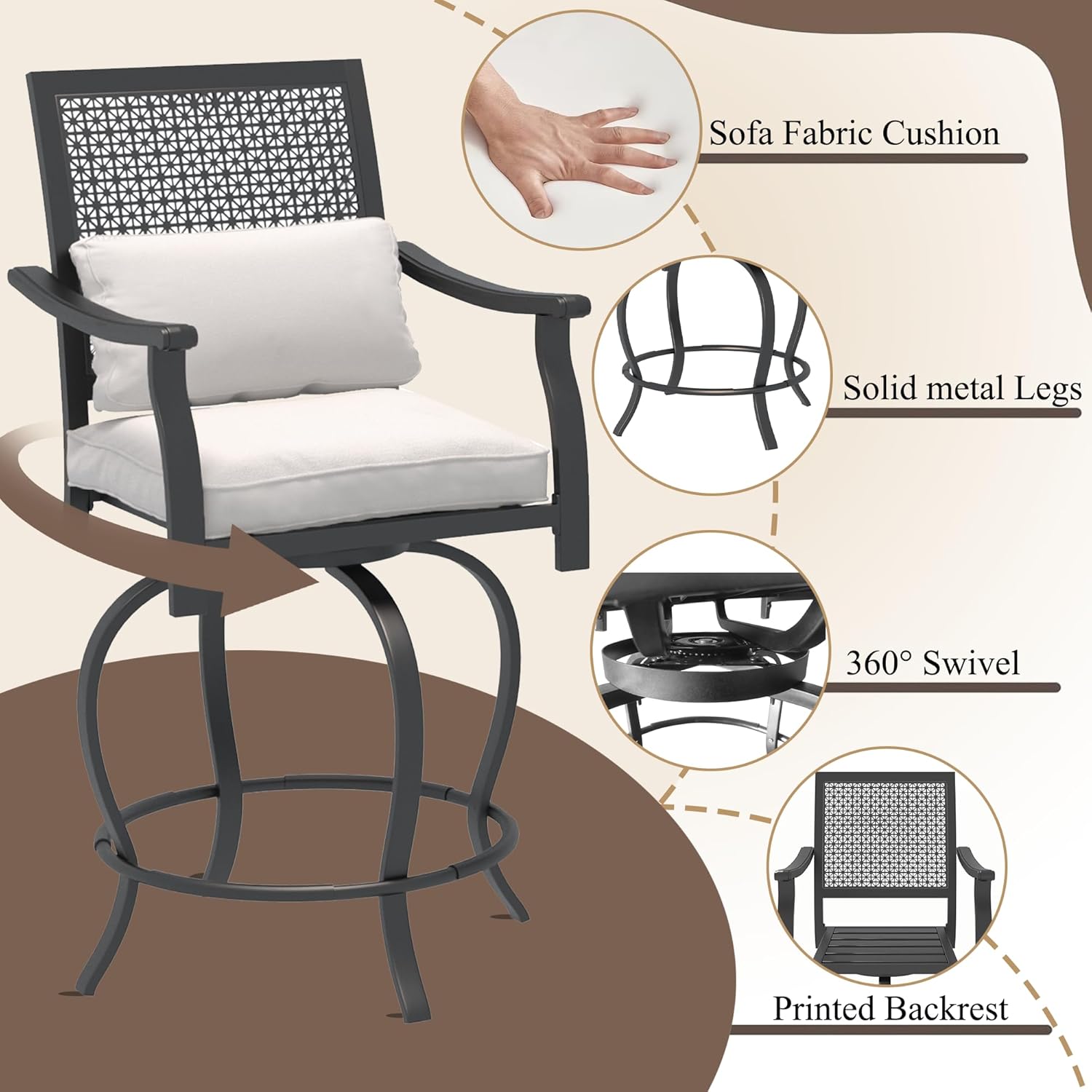 Image: Key features of the AECOJOY Outdoor Swivel Bar Stool, including the cushion, metal legs, swivel, and backrest design.
